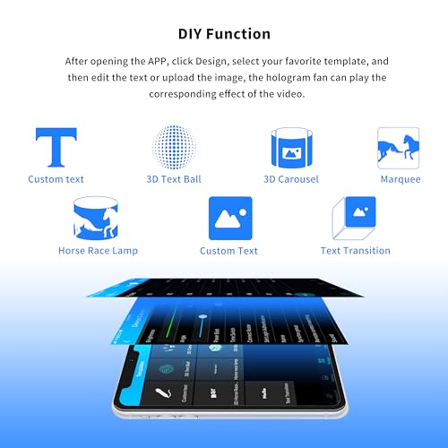 Función de bricolaje: puedes hacer tus propios videos 3D de texto o imágenes; cuando hayas conectado con éxito el WiFi del ventilador de holograma; abre la aplicación SpinDisplay; haz clic en Diseñar, y crea texto o imágenes 3D con diferentes efectos seleccionando diferentes plantillas y añadiendo diferentes textos e imágenes
